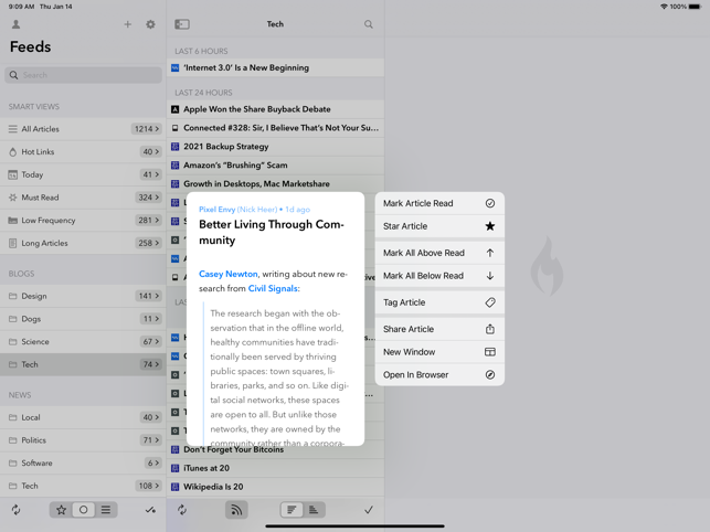 Viele Jahre ist Reeder nun schon die App meiner Wahl auf iOS und macOS, um RSS-Feeds zu konsumieren. Nachdem die Veröffentlichung der letzten großen Version ewig dauerte und der Entwickler sich auch über Monate hinweg in Schweigen hüllte, hab ich mich einfach mal auf dem Markt umgesehen. Und mit Fiery Feeds habe ich eine Alternative gefunden.